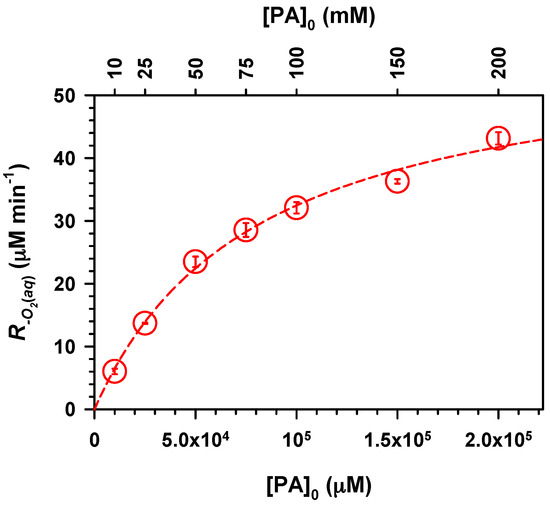 The O2(aq) decay rates () are obtained from the slopes of the measurements in Figure 1, corresponding to experiments starting with the same concentration of dissolved O2. For the range of 25 ≤ [PA]0 ≤ 200 mM, the slopes do not change from the beginning to the end of the reaction, when O2(aq) can be considered to be depleted. The exemption to this observation for [PA]0 = 10 mM, which loses its linearity after 25 min of irradiation, is solved by using the initial data to obtain a reaction rate with the same dimensions of a zero order reaction. The negative slopes extracted from Figure 1 are multiplied by −1 to plot the magnitude of the reaction rates, , in Figure 2. The Langmuir isotherm type of dependence for on [PA]0 in Figure 2 is fitted with a coefficient of correlation r2 = 0.993 by the hyperbola: