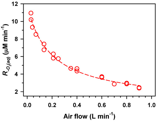 Rate of dissolved oxygen decay () vs. variable air flows. Experimental conditions: [PA]0 = 20.0 mM at pH 1.0 and 25 °C irradiated at λ ≥ 305 nm (Ia = 1.02 × 10−5 Einstein L−1 s−1). Represented reaction rates are multiplied by −1.