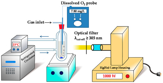 Each reaction was performed in duplicate. Fresh solutions of PA (Sigma-Aldrich, Milwaukee, WI, USA, 98.5%), freshly distilled under vacuum in ultrapure water (18.2 MΩ cm−1, Elga Purelab Flex, Veolia, Paris, France) were prepared immediately before each photolysis. The choice of working concentrations was described in detail previously; briefly, it was estimated that acidic, urban aerosols may contain 5–200 mM PA [7,23,24]. The pH of solutions was adjusted by adding hydrochloric acid (EMD, Gibbstown, NJ, USA, 37.7%) or sodium hydroxide (Amresco, Solon, OH, USA, 99.0%) and measured using a calibrated pH electrode (Orion, Thermo Scientific, Beverly, MA, USA). A 200 mL aliquot of the pH adjusted solution was transferred to a homemade quartz photochemical reactor (University of Kentucky Glass Shop, Lexington, KY, USA) with a capacity of 220 mL. This photochemical reactor was equipped with a jacket for temperature control as depicted in Figure 6 and described previously [33,34]. The solution in the photoreactor was sparged in the dark with air, O2(g), N2(g), or a custom O2(g)/N2(g) mix through a Teflon tube with an internal diameter of 1.6 mm starting 30 min prior to photolysis. The corresponding calculated diameter of the detached bubbles was ca. 4.1 mm [35]. As the sparging of the desired gas continued during the course of the experiments, the headspace of the photoreactor was filled with the selected gas during the complete course of the reaction. For experiments with variable O2(g) mixing ratios, streams of pure N2(g) and O2(g) were mixed as needed with a gas proportioner (Cole-Parmer, Vernon Hills, IL, USA) utilizing a total flow of 100 mL min−1. Monitoring of [O2(aq)] during the reactions was provided by a polarographic oxygen probe (Thermo Orion, Beverly, MA, USA, 081010MD) calibrated at maximum saturation in an air-calibration sleeve and at 0% saturation in a saturated sodium sulfite/CoCl2 solution.