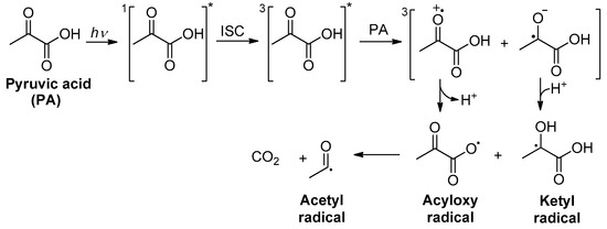 - Eugene, A.J.; Guzman, M.I. Reactivity of ketyl and acetyl radicals from direct solar actinic photolysis of aqueous pyruvic acid. J. Phys. Chem. A 2017, 121, 2924–2935. [Google Scholar] [CrossRef]