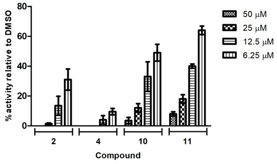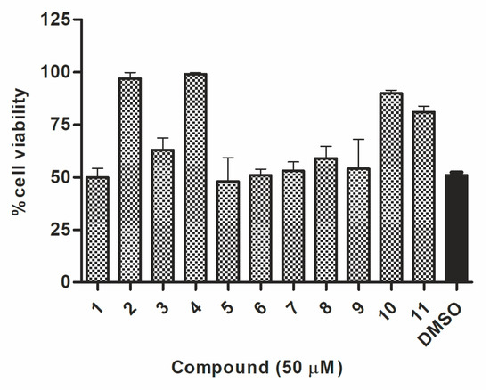 The effect of compounds 1–11 on the tick-borne encephalitis virus (TBEV)-induced cytopathic effect in A549 cells. A549 cells were infected with TBEV Hypr strain at a multiplicity of infection (MOI) of 0.1 and treated with 50 µM of compounds or DMSO (positive control). Cell death was measured and expressed as the percentage of cell viability 96 h post-infection (p.i.). Error bars indicate standard deviations from three experiments.