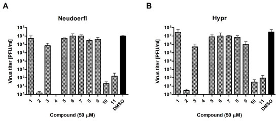 The effect of synthesized compounds on Neudoerfl and Hypr TBEV titers in A549 cells. A549 cells were infected with TBEV Neudoerfl (A) or Hypr (B) strain at an MOI of 0.1 and treated with 50 µM of compounds. At 72 h p.i., the supernatants were collected and viral titers were determined by the plaque assay. Error bars indicate standard deviations from three experiments.