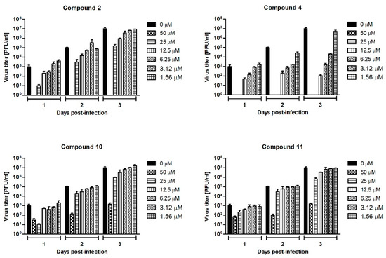 Dose-dependent effect of compounds 2, 4, 10, and 11 on TBEV titers over a 3-day experiment. A549 cells were infected with TBEV Neudoerfl strain at an MOI of 0.1 and treated with different concentrations of compounds. Culture supernatants were collected at days 1, 2, and 3 post-infection and TBEV titers were determined by the plaque assay. Error bars indicate standard deviations from three experiments.