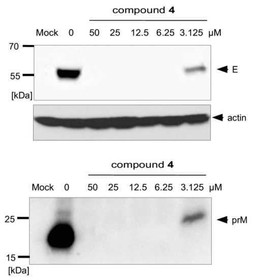 Effect of compound 4 on glycoprotein E and prM protein synthesis. A549 cells were infected with the TBEV Neudoerfl strain at an MOI of 0.1 and treated with different concentrations of the compound. At 48 h p.i., cells were lysed and proteins were separated by SDS-PAGE (gradient 10–20% polyacrylamide) under non-reducing conditions. Western blot analysis was performed using the monoclonal anti-Flavivirus group antigen antibody (4G2) for the detection of glycoprotein E, rabbit monospecific polyclonal serum for pr fragment detection, and anti-actin monoclonal antibody.