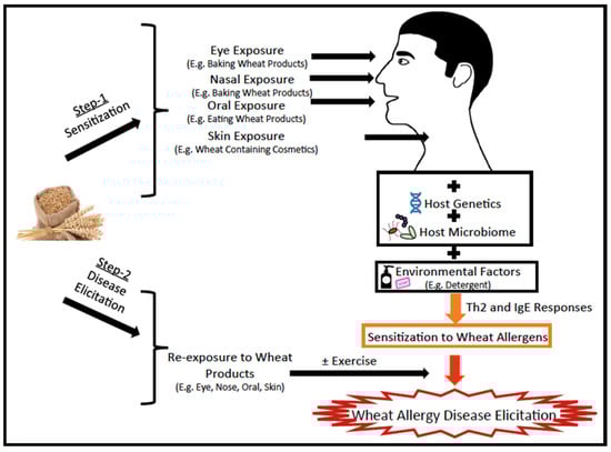 Prevalence of wheat allergies has increased from 0.2% to 0.4% in the USA between 1996 and 2007 [,]. However, mechanisms underlying wheat allergies are not well understood at present. The genesis of wheat allergy is thought to be similar to other food allergies involving two steps: Sensitization to wheat allergens and wheat allergy disease elicitation among sensitized subjects (Figure 1) [,,]. Sensitization of genetically susceptible hosts occur upon exposure to wheat products (via the eye, nasal, oral, skin routes) in the context of a dysregulated host microbiome and environmental co-factors (e.g., detergents in wheat containing cosmetics, such as facial soap) results in activation of T helper (Th)-2 lymphocyte responses with consequent IgE antibody production [,,]. Re-exposure of sensitized subjects to wheat results in elicitation of disease; in some cases, exercise after re-exposure can trigger the disease (Figure 1) [,,].