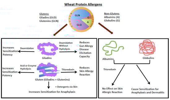 Among the major allergenic foods, wheat is the most cultivated crop in the world [,]. Food allergens in general are water/saline soluble proteins. However, wheat contains four different classes of protein allergens: Water-soluble (albumins), saline-soluble (globulins), alcohol-soluble (gliadins), and acid-soluble (glutenins) protein allergens (Figure 2). Gliadins are the most abundant proteins followed by glutenins, albumins, and globulins. The term, gluten, includes both gliadin and glutenin (Figure 2).