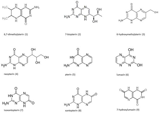 - Tomšíková, H.; Tomšík, P.; Solich, P.; Nováková, L. Determination of pteridines in biological samples with an emphasis on their stability. Bioanalysis 2013, 5, 2307–2326. [Google Scholar] [CrossRef]