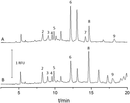 - Couderc, F.; Ong-Meang, V.; Poinsot, V. Capillary electrophoresis hyphenated with UV-native-laser induced fluorescence detection (CE/UV-native-LIF). Electrophoresis 2017, 38, 135–149. [Google Scholar] [CrossRef]