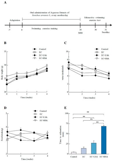 Effects of SA on improving anti-fatigue activity in exercise trained mice. (A) Scheme of animal experiments. 8-week old C57BL/6J mice were assigned to 4 groups (n = 10) for swimming exercise training or SA supplementation: sedentary control with vehicle treatment (Control); swimming training exercise with vehicle treatment (EC); swimming training exercise with 250 mg/kg SA (EC + LSA) or 500 mg/kg SA (EC + HSA). An exhaustive swimming exercise test was performed for assessments of anti-fatigue activity; (B) Body weight trend; (C) Water intake trend; (D) Food intake trend; (E) Time to exhaustion. Data presented as mean ± SEM, n = 10, ** p < 0.01.
