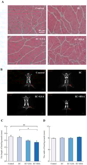 Histological examination on mice hind leg muscle structure in exercise trained mice. (A) H&E staining results; (B) MRI results; (C) hind limb thigh muscle length (mm); (D) hind leg skeletal muscle; All data are expressed as the mean ± SEM (n ≥ 3). * p < 0.05, ** p < 0.01.