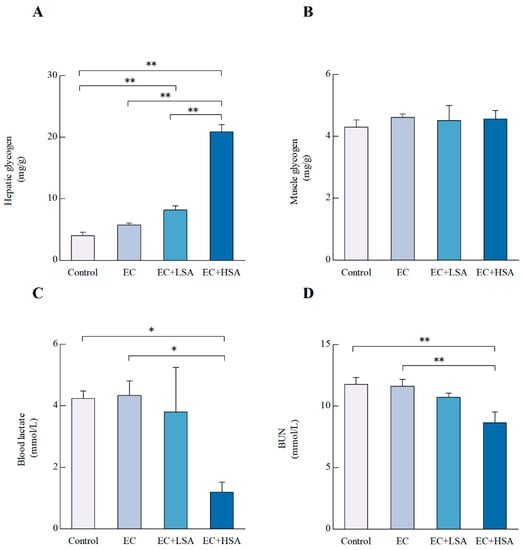 Glycolysis, the main energy source for fierce exercise in a short time, and blood lactate is the glycolysis product of carbohydrate in the condition of anaerobic. Therefore, there is a close relationship between blood lactate and workload intensity, and blood lactate is one of the important parameters of the exercise intensity or the fatigue degree [23]. In this study, a high dose of SA significantly suppressed the contents of blood lactate (p < 0.05) (Figure 3C). Besides, it has also been reported that blood urine nitrogen (BUN) causes fatigue [24]. High dose of SA suppressed the contents of BUN (p < 0.01) compared with group EC (Figure 3D).
