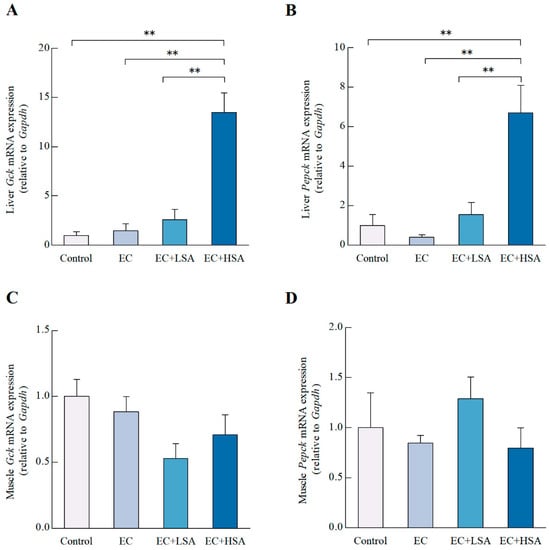 The glucokinase (GCK) acts as an eminent player in regulating the glucose metabolism and homeostasis [25]. In the current study, we studied the effects of SA supplementation on the mRNA expression of Gck in mice liver and muscle. As illustrated in Figure 4A, high dose of SA significantly increased the mRNA expression of Gck (p < 0.01) compared with EC group in mice liver. However, there existed no significant difference of Gck mRNA expression in mice muscle among these groups (Figure 4C).