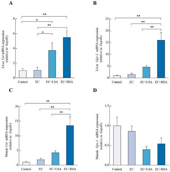 Effects of SA on antioxidant gene expressions in exercise trained mice. The mRNA expressions of (A) Cat, (B) Gpx-1 in mice liver; The mRNA expressions of (C) Cat, (D) Gpx-1 in mice muscle. Data presented as mean ± SEM, n = 6. * p < 0.05, ** p < 0.01.