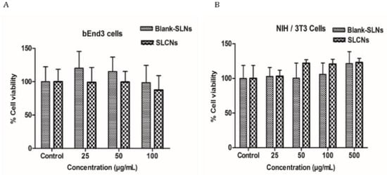 The cell viability of the SLN and SCLN was compared between that in bEnd3 cells or NiH/3T3 cells, which is shown in Figure 2. The increase of about 100 μg/mL in the concentration of SLCN in brain endothelial cells showed no cellular toxicity while the increase of about 500 μg/mL in the NIH/3T3 cells showed no cellular toxicity for both SLN and SLCN.