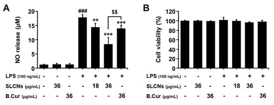 Most of the naturally-derived candidates were reported to be safe with negligible/null toxicity. Considering the potential of toxicity involved during formulation process in this study, we evaluated the cytotoxic effects of SLCN, base curcumin and/or LPS in BV2 cells. The cells were pretreated with SLCN (18 and 36 μg/mL) and base curcumin (36 μg/mL) for 1 h before the addition of LPS (100 ng/mL). The incubation with LPS alone markedly increased the NO production in the BV2 cells compared to the control (17.86 ± 0.98 µM; Figure 3A; ###p < 0.001 vs. untreated group). However, the pretreatment with SLCN and base curcumin prevented this increase in the levels of NO production in LPS-stimulated BV2 cells (Figure 3A; **p < 0.01 and ***p < 0.001 vs. LPS-treated group). Moreover, SLCN resulted in a significantly greater inhibition of NO compared to base curcumin for the same concentration (Figure 3A; $$p < 0.01 vs. SLCN-treated group). The cell viability was determined using an MTT assay. According to the results of our study, both drugs and LPS treated cells exhibited minimal/null toxic effects at the selected concentrations (Figure 3B).