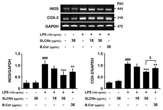 BV2 cells were induced with LPS (100 ng/mL) in the presence or absence of SLCN and base curcumin at various concentrations (18 and 36 μg/mL, 36 μg/mL, respectively). LPS treatment significantly increased the iNOS and COX-2 mRNA levels (###p < 0.001 vs. untreated group) but pretreatment with SLCN and base curcumin at the indicated concentrations inhibited this LPS-induced mRNA expression of iNOS and COX-2 (Figure 4; **p < 0.01 and ***p < 0.001 vs. LPS-treated group). Furthermore, SLCN improved the COX-2 mRNA level compared to the base curcumin at the same concentration (Figure 4; $p < 0.05 vs. SLCN-treated group). As discussed earlier, this can be attributed to the enhanced drug delivery potential of SLN. Thereby, as reported in earlier studies, the relatively enhanced bioavailability of curcumin released from SLCN is likely responsible for its higher suppression of iNOS and COX-2 mRNA expressions compared to its free form.