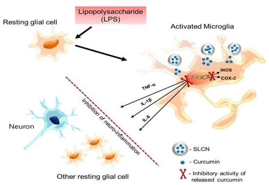 Phytoextracts have been used for generations as traditional treatments for neurodegenerative diseases [,,,]. Curcumin is a major bioactive compound that is found in turmeric powder and it is used in traditional Indian and Chinese medicine due to its various health enhancing effects to treat the inflammation associated with chronic diseases [,,,,]. Furthermore, several in vitro and in vivo mechanisms have determined for the antineuroinflammatory pathway of curcumin. Its efficacy is still limited due to its low solubility, higher degradation by enzymes, lower absorption, and faster elimination [,,,,]. To improve the properties and biological activity, novel lipid-based delivery vehicles are in greater demand [], such as solid lipid nanoparticles (SLN).
