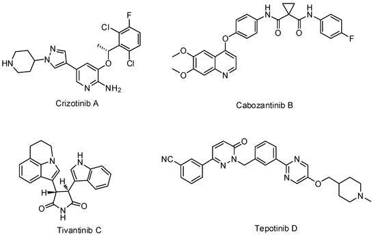 Cancer is a major disease that seriously threatens human health. According to statistics from the World Health Organization (WHO), an estimated 9.6 million patients died from cancer in 2018 [1]. Therefore, the development of effective anti-tumor drugs is an important task for medicinal chemists. Mesenchymal−epithelial transition factor (c-Met), the high affinity receptor for hepatocyte growth factor (HGF), is a unique subfamily of receptor tyrosine kinases (RTKs) [2]. Physiologically, HGF/c-Met signaling plays important roles in cell growth, survival, motility, and morphogenesis [3]. However, aberrant c-Met activation has been observed in a wide variety of human cancers, including liver and lung cancer, as a consequence of gene amplification or rearrangement, transcriptional regulation, as well as autocrine or paracrine ligand stimulation [4,5,6,7,8,9]. Due to its status as a proto-oncogene and the correlation of its dysregulation with a poor prognosis, c-Met is becoming a promising target for cancer therapy [10]. The present c-Met kinase inhibitors are divided into three groups according to their binding modes and structural features. Type I c-Met kinase inhibitors, such as Crizotinib A, are adenosine triphosphate (ATP)-competitive inhibitors with a U-shaped binding mode at the ATP binding site (Figure 1) [11,12]. Type II c-Met kinase inhibitors are usually multi-targeted agents (for example, Cabozantinib B) (Figure 1) [13]. Type I inhibitors are generally described as specific for c-Met kinase and more selective than class II inhibitors. However, they have limited activity against the Tyr1230His mutation that is present in certain human tumors [4]. Type III inhibitors include other atypical c-Met kinase inhibitors, such as Tivantinib C (Figure 1) [14].