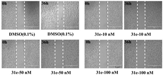 Tumor cell migration is one of the major causes of death in cancer patients. To evaluate the inhibitory ability of 31e against tumor cell migration, hepatic carcinoma 97H cells (5 × 104 cells per well) were seeded in six-well plates with or without the presence of 31e and cultured as confluent monolayers. The results shown in Figure 4 demonstrate that 31e can inhibit tumor cells’ migration. At a concentration of 10 nM, 31e displayed moderate inhibition of migration. Migration was significantly suppressed when 31e was used at a dosage of 50 nM. Tumor cells’ migration was completely suppressed with 100 nM of 31e.