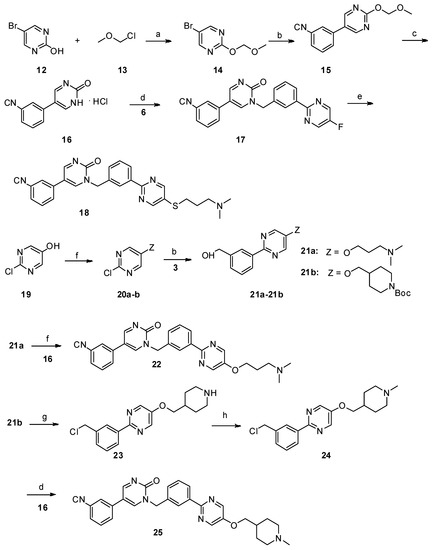Synthesis of 5-(3-cyanophenyl)-1-(3-(5-((3-(dimethylamino)propyl)thio)pyrimidin-2-yl)benzyl)pyrazin-2(1H)-one (11a). In a 200 mL two-necked round-bottomed flask provided with a magnetic stirrer and condenser, 50 mmol of thiourea 9 were dissolved in 60 mL of absolute ethanol. Compound 8 (3.161 mg, 20 mmol) was added in one portion in the thiourea solution. After heating at reflux for 12 h, the reaction mixture was concentrated by rotary evaporation under reduced pressure. The desired compound 10 was obtained as a white solid and was further used without purification [18].