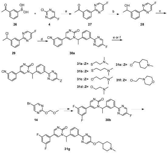 The synthesis of compounds 31a–g is summarized in Scheme 3. Intermediate 27 was prepared by the Suzuki coupling reaction of (3-acetylphenyl)boronic acid and 2-chloro-5-fluoropyrimidine. The reduction of compound 27 with sodium borohydride and then chlorination with thionyl chloride produced 29. In the presence of potassium carbonate, 29 reacted with compound 16 to give 30a, which reacted with the corresponding amino alcohols or amino thiols to produce target compounds 31a–f (the R and S configurations of 31e were prepared and are shown in the supporting information). The fluorine-containing target compound 31g was prepared with a similar procedure, starting from compound 14 and intermediate 30b.