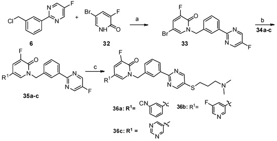 The synthesis of target compounds 36a–c is listed in Scheme 4. Compound 33 was obtained by the reaction of 6 and commercially available 5-bromo-3-fluoropyridin-2(1H)-one 32. Then, the reaction with aryl boric acids 34a–c afforded the key intermediates, 35a–c, which reacted with 10 in the presence of NaOH to provide target compounds 36a–c.