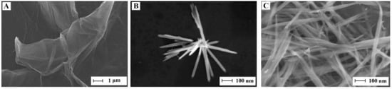 SEM images of GO (A), MnO2 NRs (B), and MnO2 NRs-ERGO (C).