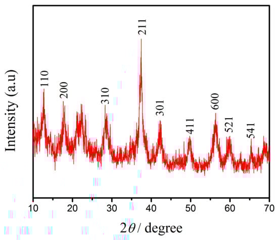 Figure 2 illustrates the XRD pattern of the MnO2 NRs recorded in the 2θ range of 10–70°. It was observed that the characteristic reflections of the MnO2 NRs were shown at 2θ = 12.1°, 18.0°, 29.3°, 37.5°, 42.1°, 50.1°, 56.5°, 60.5°, and 69.8°, corresponding to the lattice planes of (110), (200), (310), (211), (301), (411), (600), (521) and (541), which were well coincided with the standard data file (JSPDS 44-0141), suggesting α-MnO2was perfectly crystallized.