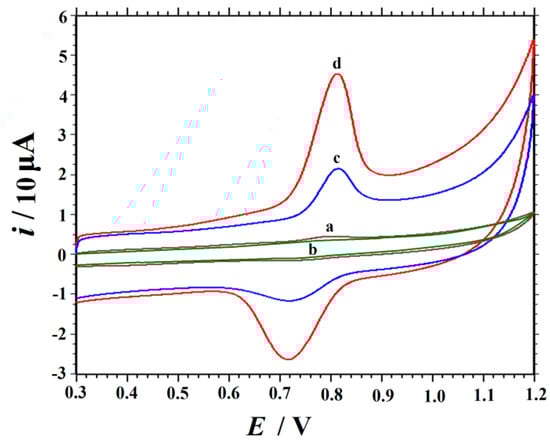 Cyclic voltammograms of 0.1 mM SY recorded at GCE (a), GO/GCE (b), ERGO/GCE (c) and MnO2 NRs-ERGO/GCE (d) in 0.3 M citric acid-sodium citrate buffer (pH 4.5), scan rate 0.1 V/s.