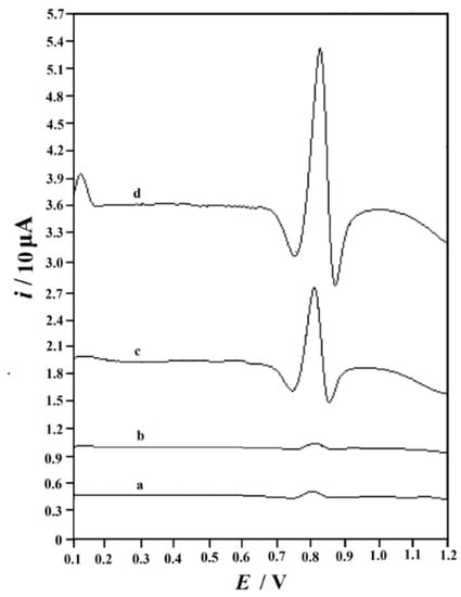 The electrochemical behavior of SY on the surface of GCE, GO/GCE, ERGO/GCE, and MnO2 NRs-ERGO/GCE was also studied using second derivative linear sweep voltammetry (SDLSV), and the results are shown in Figure 4. On the surface of GCE (curve a), the oxidation peak of SY was very weak (ipa = 1.537 μA). When using the GO/GCE (curve b), the oxidation peak current of SY decreased slightly (ipa = 1.244 μA). However, the oxidation peak of SY at 0.816 V was enhanced significantly (ipa = 24.30 μA) on the surface of ERGO/GCE (curve c), indicating the superiority of ERGO due to its good conductivity, big surface area, and electrocatalytic ability towards SY. While on MnO2 NRs-ERGO/GCE the biggest peak current of 60.08 μA appeared at 0.814 V (curve d). The remarkable peak current enlargement revealed that MnO2 NRs-ERGO/GCE exhibited strong signal enhancement toward the oxidation of SY. From the comparison, we clearly found that MnO2 NRs-ERGO facilitated the oxidation of SY, and was more sensitive for SY detection.