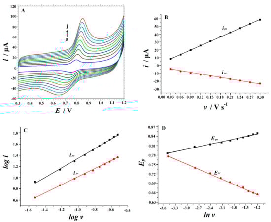 (A) Cyclic voltammograms of 10 μM SY at MnO2 NRs-ERGO/GCE with different scan rates. Curves (a–j) are obtained at 30, 60, 90, 120, 150, 180, 210, 240, 270 and 300 mV/s, respectively. (B) The plot for the dependence of peak current on scan rate. (C) The relationship between log ip and log v. (D) The relationship between Ep and ln v.