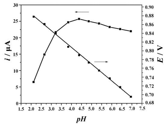 Effects of pH on the current response and potential response of 10 μM SY. Accumulation potential: 0.1 V, accumulation time: 180 s, scan rate 0.1 V/s.
