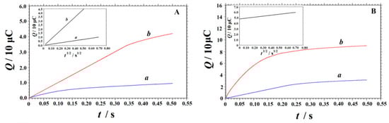 In the formula, A is the surface area of the working electrode, c is the substrate concentration, D is the diffusion coefficient, Qdl is the double layer charge, which can be eliminated by background subtraction, Qads is the adsorption charge. This experiment was performed in 1.0 mM K3[Fe(CN)6] solution containing 1.0 M KCl, where the diffusion coefficient of K3[Fe(CN)6] is 7.6 × 10−6 cm2 s−1 [51]. According to the experiment results (shown in Figure 7A), A was calculated to be 0.061 cm2 and 0.293 cm2 for GCE and MnO2 NRs-ERGO/GCE, respectively. These results showed that the effective surface area of the modified electrode increased obviously, which would improve the current response and decrease the detection limit.