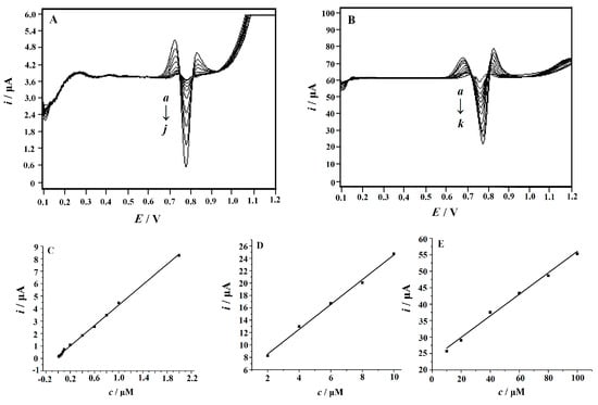 Second-order derivative linear scan voltammograms obtained at MnO2 NRs-ERGO/GCE in 0.3 M citric acid-sodium citrate buffer (pH 4.5) containing different concentrations of SY. (A) From a to j: 0.01, 0.02, 0.04, 0.06, 0.08, 0.1, 0.2, 0.4, 0.6, 0.8 μM; (B) From a to k: 1.0, 2.0, 4.0, 6.0, 8.0 10, 20, 40, 60, 80, 100 μM; (C–E) the calibration plots of the concentration of SY versus peak current (C: 0.01~2.0 μM; D:2.0~10 μM; E: 10~100 μM). Accumulation potential: 0.1 V, accumulation time: 180 s, scan rate 0.1 V/s.