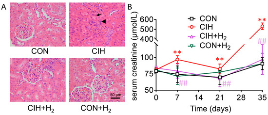 Serum creatinine level is an important marker of kidney injury as it inversely correlates with the glomerular filtration rate. No statistically significant differences were found among the four groups before initiation of the CIH and/or H2. Serum creatinine levels were significantly higher in CIH rats on 7th, 14th, and 35th day as compared with the corresponding control group (each p < 0.01). Notably, increased creatinine level was normalized by H2 (each p < 0.01). H2, when treated alone, had nearly no effect on creatinine levels (Figure 1B).