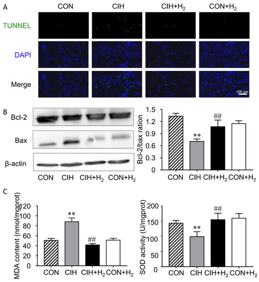 Effect of H2 on CIH-induced renal cell apoptosis and oxidative stress. (A). Representative images of cell apoptosis. (B). Western blot showing that H2 inhibited the decrease of Bcl-2/bax ratio. (C). H2 administration suppressed renal MDA (malondialdehyde) content and increased SOD (superoxide dismutase) activity. ** p < 0.01 vs. normoxia group; ## p < 0.01 vs. CIH group.