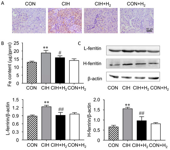 The content of iron in the kidney was confirmed by tissue iron assay kit from the Nanjing Jiancheng (Figure 3B). The iron content in the kidney increased significantly in the CIH group compared to control (p < 0.01). In the CIH + H2 group, the iron deposition was inhibited by H2 (p < 0.05).