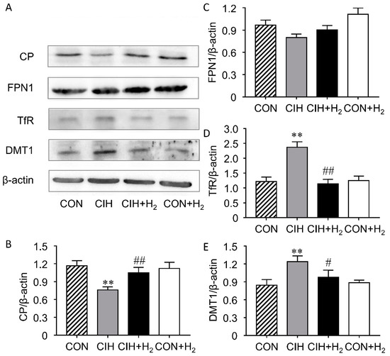 2.5. H2 Suppresses CIH-Induced Increase Expression of Renal TfR and DMT1 and Decrease of CP