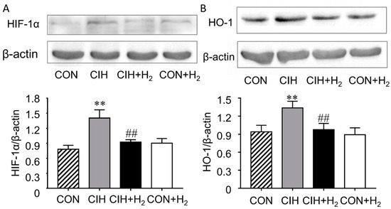 Effect of H2 on renal HIF-1α (hypoxia-inducible factor-1α) and HO-1 expression. (A). H2 inhibited the increase of HIF-1α expression. (B). H2 suppressed the increase of HO-1 expression. ** p < 0.01 vs. normoxia group; ## p < 0.01 vs. CIH group.