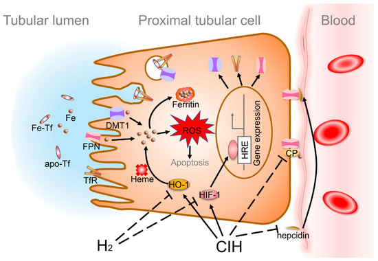 Iron is a required element in the body that acts as a component of many enzymes to exert its physiological actions [11]. However, excessive iron could accelerate the production of damaging ROS, leading to lipid peroxidation and DNA mutagenesis [12]. The delivery of transferrin bound iron to cells is through transferrin–transferrin receptor interaction on the cell surface. Following internalization of the complex by clathrin-mediated endocytosis, iron traverses from the plasma membrane to enter the cytosol [13]. When transferrin saturation is exceeded, non-transferrin bound iron uptake will take place through divalent metal transporter 1 (DMT1) and ferroportin (FPN). The DMT1 distribution was observed in mice by specific immunoreactivity in proximal tubules, suggesting that DMT-1 may function on apical iron entry [14]. As the sole cellular iron efflux channel identified to date in vertebrates, FPN extrudes iron from the cells [15]. FPN expressed in proximal tubule cells of rats and may provide a means of iron exit [16]. Iron overload may develop kidney impairment and can be an early and sensitive indicator in CIH-induced kidney disease. Wang et al. assessed the probability of iron deposition in patients undergoing renal biopsy, they found thirty-four of them showed definite iron staining [17]. Moreover, it has been shown that iron is often sequestered in cells in CKD patients [18]. Wareing et al. found that serum iron is available for glomeruli to filter, even the majority of the filtered iron is followed by tubular reabsorption [19].