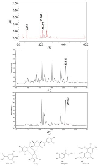 | Ethyl gallate | 0.27 ± 0.01 h | 0.28 ± 0.03 h | 0.88 ± 0.02 f | 1.84 ± 0.06 d |
