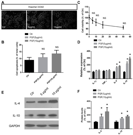 PGF promote the anti-inflammatory factors’ release of IPEC-J2 cells. (A) Representative images display the nuclear morphology of IPEC-J2 cells under different doses of PGF treatment for 24 h, labeled with Hoechst 33342. (B) Quantification shows that PGF doesn’t induce cell apoptosis in IPEC-J2 cells, according to Hoechst staining. (C) Quantification shows the cell viability of IPEC-J2 cells treated with different concentrations of PGF for 24 h. (D) Quantification shows increased expression levels of anti-inflammatory factors, but not pro-inflammatory factors, after the treatment of PGF (5 μg/mL and 10 μg/mL). (E and F) Western blots and quantification show increased protein levels of anti-inflammatory factors after the treatment of PGF (5 μg/mL and 10 μg/mL). Error bars indicate SEM. * p < 0.05, NS, not significant.