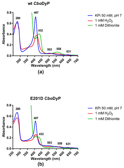 (a) The spectrum of wild-type CboDyP (20 µM) in KPi 50 mM, pH 7 showing a Soret band at 407 nm (blue line). The effect of the addition of sodium dithionite (green line) and the addition of hydrogen peroxide (red line) on the position and amplitude of the Soret band can be observed. (b) The spectrum of E201D CboDyP (20 µM) in KPi 50 mM, pH 7 showing spectral changes when adding hydrogen peroxide (red line) or dithionite (green line).