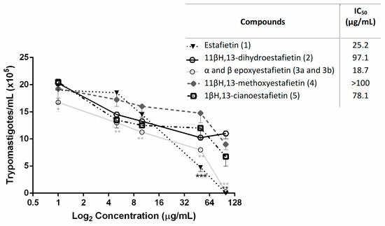 Trypanocidal activity of estafietin (1) and estafietin derivatives (2–5) against T. cruzi bloodstream trypomastigotes. Bloodstream trypomastigotes were assayed in duplicate in the presence of 0 to 100 µg/mL of estafietin (1), 11βH,13-dihydroestafietin (2), α- (3a) and β-epoxyestafietin (3b) (1:4 mixture), 11βH,13-methoxyestafietin (4) and 11βH,13-cianoestafietin (5). Cultures were done in 96-well plates with 1.5 × 106 parasites/mL over 24 h. The living parasites were then counted in a Neubauer chamber. Symbols represent mean ± SEM. Each treatment was compared to controls: parasites incubated with culture medium only. * p < 0.05, ** p < 0.01 and *** p < 0.005.