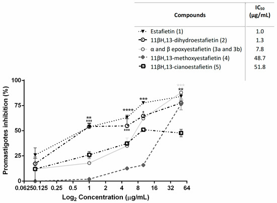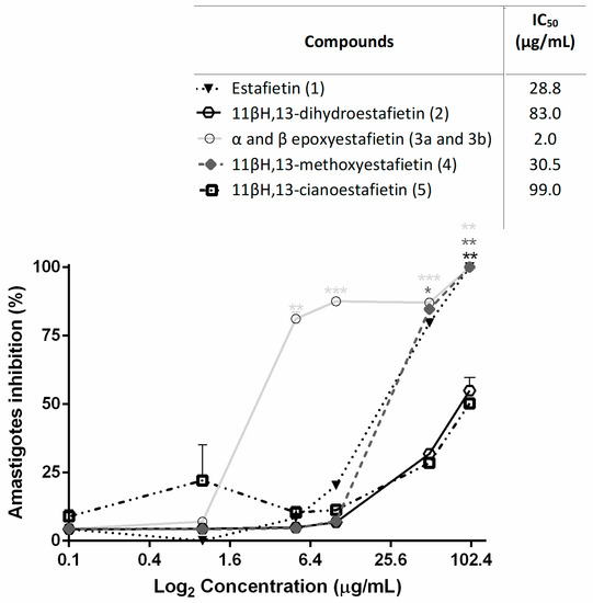 Leishmanicidal activity of estafietin (1) and estafietin derivatives (2–5) on L. braziliensis promastigotes. Parasites were cultured for 72 h in the presence of each compound (0–50 µg/mL). The inhibition of parasite growth was evaluated by a [3H] thymidine uptake assay. The percentage of inhibition was calculated as 100 − [(cpm of treated parasites)/(cpm of untreated parasites)] × 100. Values represent mean ± SEM from three independent experiments carried out in triplicate. Each treatment was compared to controls: parasites incubated with culture medium only. * p < 0.05, ** p < 0.01 and *** p < 0.005.