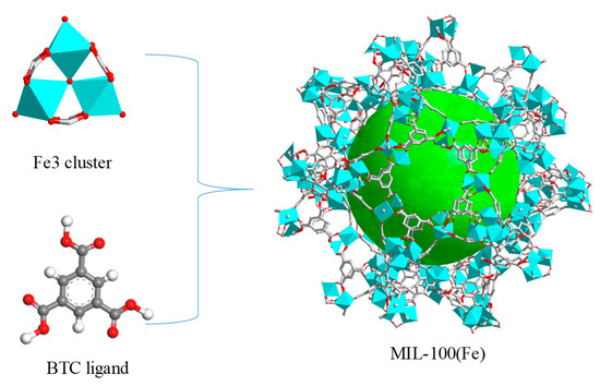 - Horcajada, P.; Surbl, S.; Serre, C.; Hong, D.Y.; Seo, Y.K.; Chang, J.S. Synthesis and catalytic properties of MIL-100(Fe), an iron(iii) carboxylate with large pores. Chem. Commun. 2007, 27, 2820. [Google Scholar] [CrossRef]