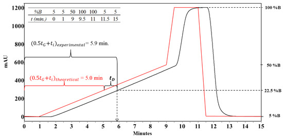Figure 1. Dwell time determination [26,27,28]. Programed elution gradient (red line), experimental gradient performed by the HPLC system (black line). Delay time (ti), gradient time (tG), dwell time (tD).