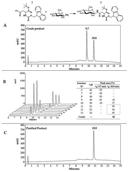 For synthetizing N-glucopeptides using SPPS-Fmoc/tBu and building blocks methodology, it is necessary to obtain the intermediary Fmoc-Asn(GlcAc4)-OtBu: Fmoc-l-Asn-(2,3,4,6-tetra-O-acetyl-β-d-N-glucopyranosyl)-OtBu. Briefly, the 2,3,4,6-tetra-O-acetyl-β-d-N-glucopyranosylamine was treated with Fmoc-Asp(OH)-OtBu (1:2 equivalents) that was previously activated with Dicyclohexylcarbodiimide (DIC) [29]. The final product was analyzed via RP-HPLC (Figure 3A) using an elution gradient of 5/5/100/100/5/5% solvent B in 0/1/18/20/20.5/24 min. The chromatographic profile presents two signals at 9.7 and 10.8 min that correspond to the Fmoc-Asp(OH)-OtBu (1) and the Fmoc-Asn(GlcAc4)-OtBu (2), respectively (Figure 3A).
