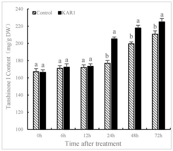 S. miltiorrhiza hairy root was treated with and without KAR1 (control) to evaluate the influence of KAR1 on the generation of T-I. The effects of KAR1 on the content of T-I in S. miltiorrhiza were present in Figure 1. Treatment with KAR1 improved the content of T-I (205.13 mg/g) compared to the control (176.84 mg/g) at 24 h after KAR1 treatment. There is little literature on the influence of KAR1 on the production of secondary metabolite in medicinal plants. Aremu et al. [27] reported that treating Tulbaghia ludwigiana with smoke water caused a significant increase in the content of flavonoids compared to the control. Soós et al. [28] demonstrated that smoke water could upregulate the expression of genes and promote biosynthesis of phenolic compounds. Data obtained from this study indicated that KAR1 could enhance the content of T-I in S. miltiorrhiza, which implied that using KAR1 for enhancing the production of tanshinones has significant scientific and industrial implications in hairy root production.