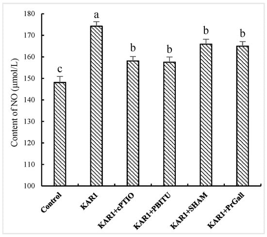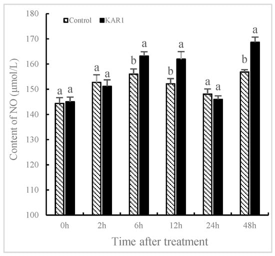 Time courses of NO level of S. miltiorrhiza hairy roots. The roots treated with KAR1 were harvested at determined time points. NO contents of the root were then determined. Data are means of three replicates ± SD. Different letters indicate significantly different values according to one-way ANOVA followed by Tukey’s test (p < 0.05).